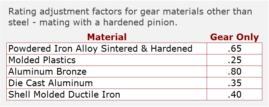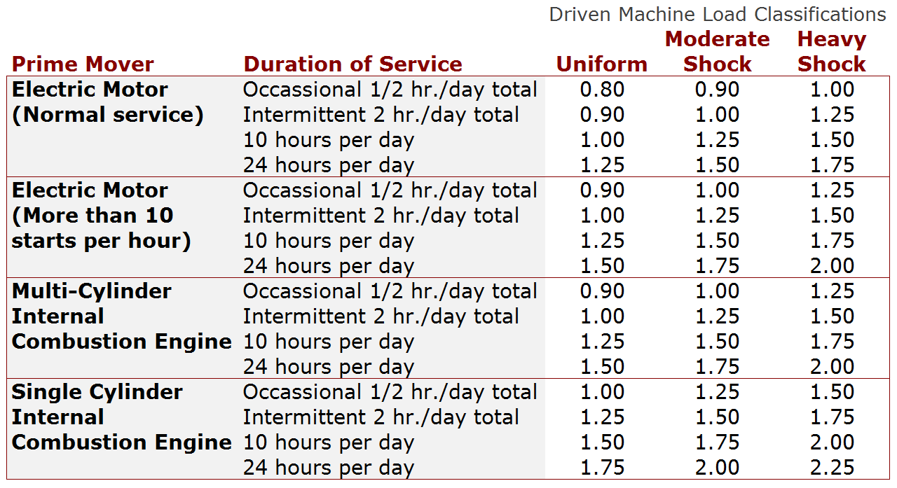 Horsepower and torque ratings are based on a unity service factor (1.0) as defined in the table below. The ratings given in the tables are surface durability capacities and do not take into account any thermal limits.
